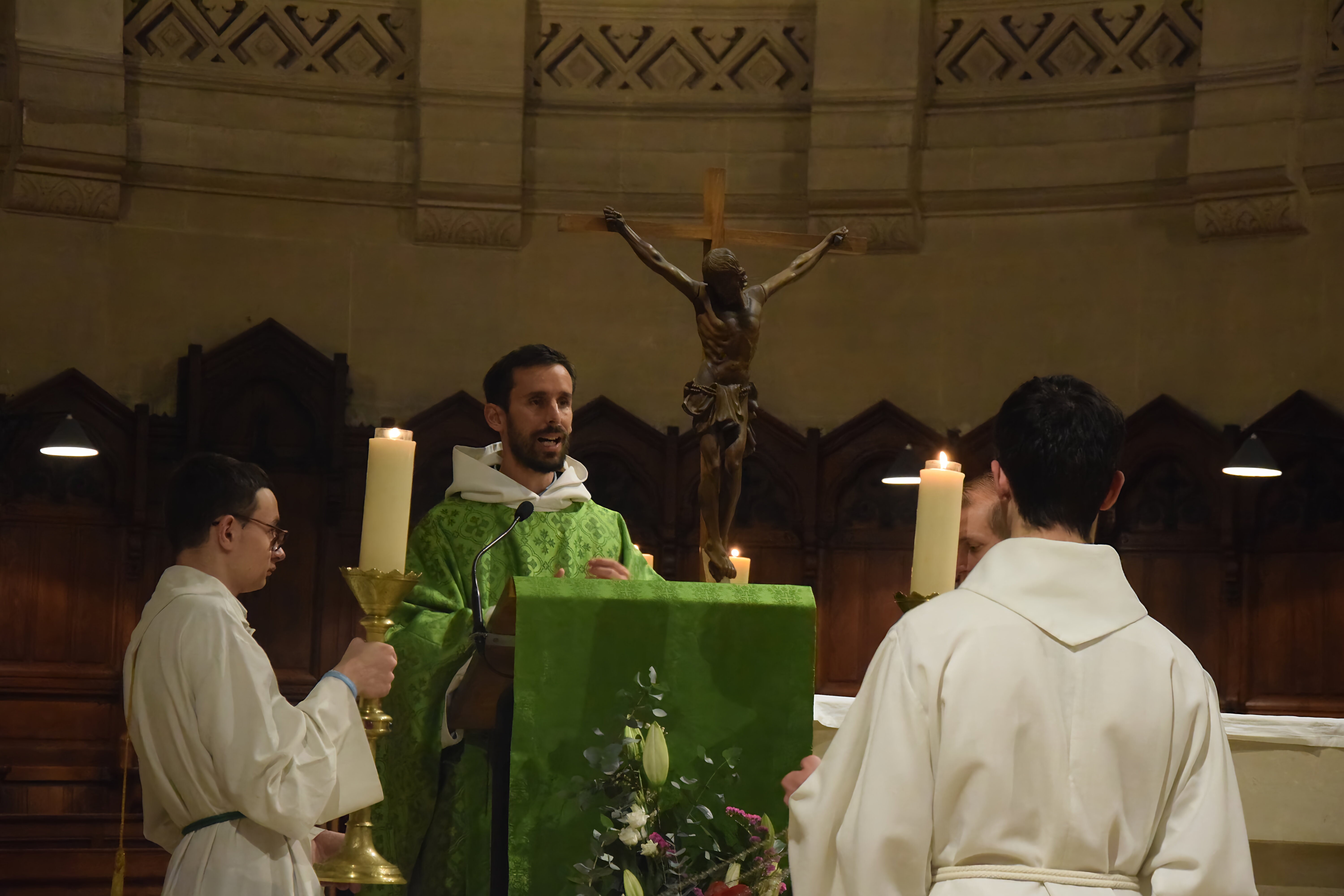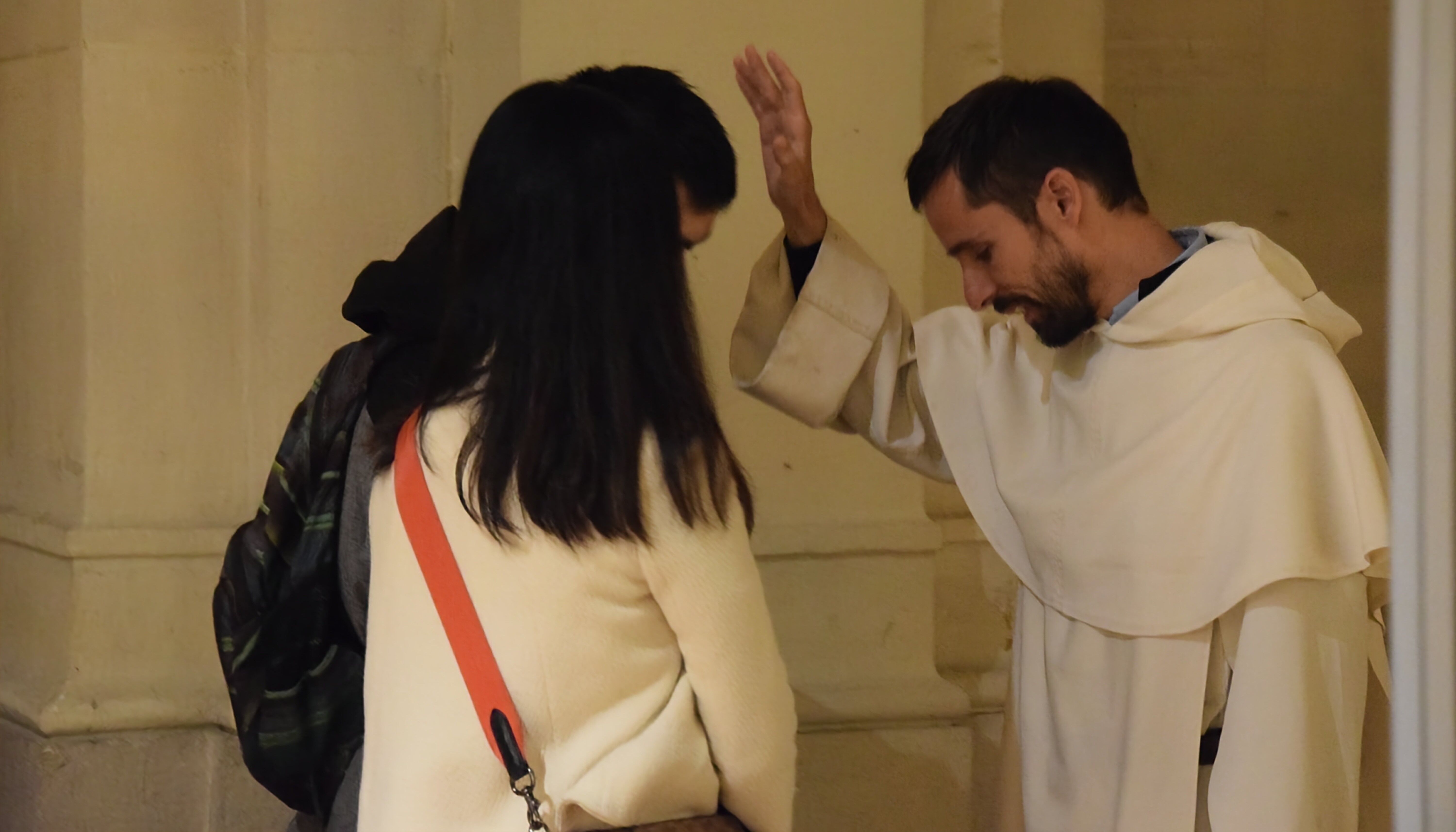 Vous n'êtes pas assez fiers d'être fils de Dieu. Vous n'êtes pas assez fiers d'être catholiques au 21e siècle. » S'ils ont l'habitude de l'entendre derrière leur écran, c'est bien en chair et en os que le Frère Paul-Adrien d'Hardemare s’est présenté à ses fidèles ce soir du 12 février 2023. Le Youtubeur aux plus de 160 000 abonnés est une nouvelle voix qui porte dans l'Église catholique française. Pour rassembler sa communauté, le prêtre-influenceur n'a pas fait les choses à moitié : le couvent de l’Annonciation des Dominicains*, situé à deux rues des Champs-Élysées, a été réservé pour une grande messe qu’il officie. Si l'extérieur ne paye pas de mine et ressemble à n'importe quel immeuble du centre parisien, l'endroit est moderne et spacieux. L'immense fresque de Jésus surplombant l'autel donne le ton dès l'entrée dans la nef. Malgré la beauté du lieu, les participants ne sont pas là pour visiter. Tous sont venus spécialement pour le moine. « Ça fait trop bizarre de le voir en vrai » entend-on souffler sur les bancs de prière.