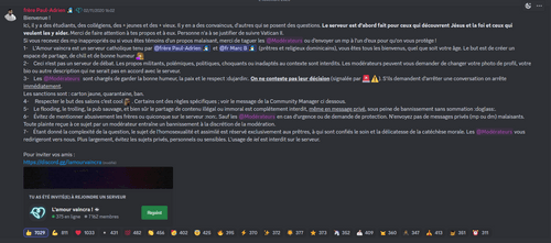 C'est le prétexte qui sert aussi au Frère Paul Adrien d'Hardemare pour régner d'une main de fer (dans un gant de velours) sur la discipline de son Discord. Très attaché à en faire un endroit « de chill et de bonne humeur », la modération du Dominicain est pour le moins stricte et laisse peu de place à la réflexion. Les débats sont contrôlés, parfois jusque dans les messages privés. Et « si les modérateurs demandent d'arrêter une conversation, on arrête immédiatement ». Symptomatique, la question de l'homosexualité est réservée aux prêtres et l'usage de iel est strictement interdit.